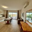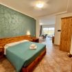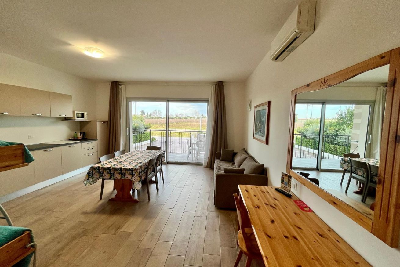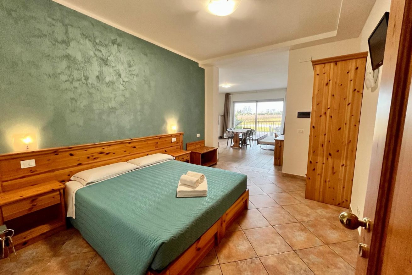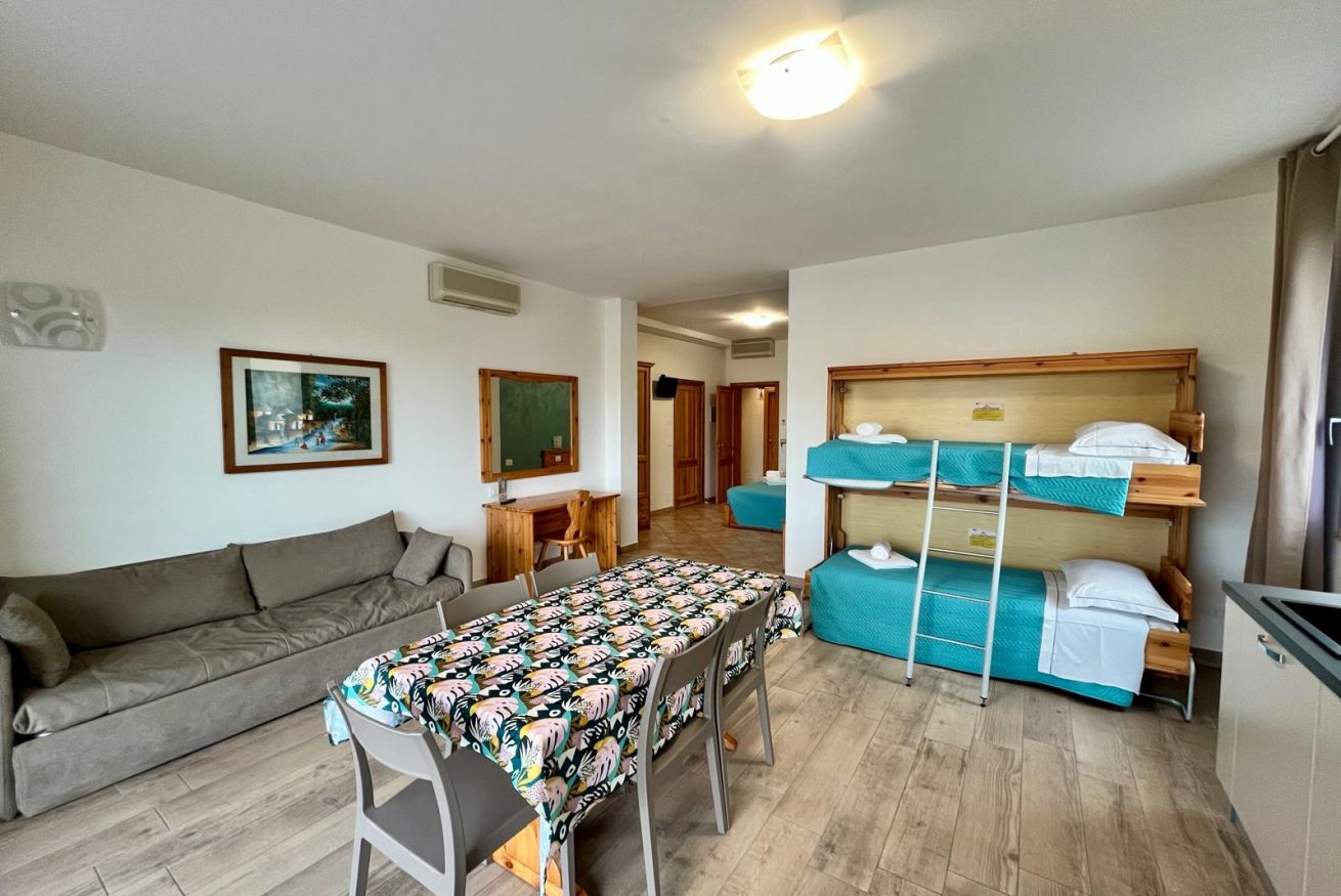 Stanza di 45 mq circa, con ampia zona giorno fornita di tavolo con 4 sedie, bollitore, forno a microonde, frigorifero, divano. Terrazzo vista piscina con tavolo e sedie all’aperto